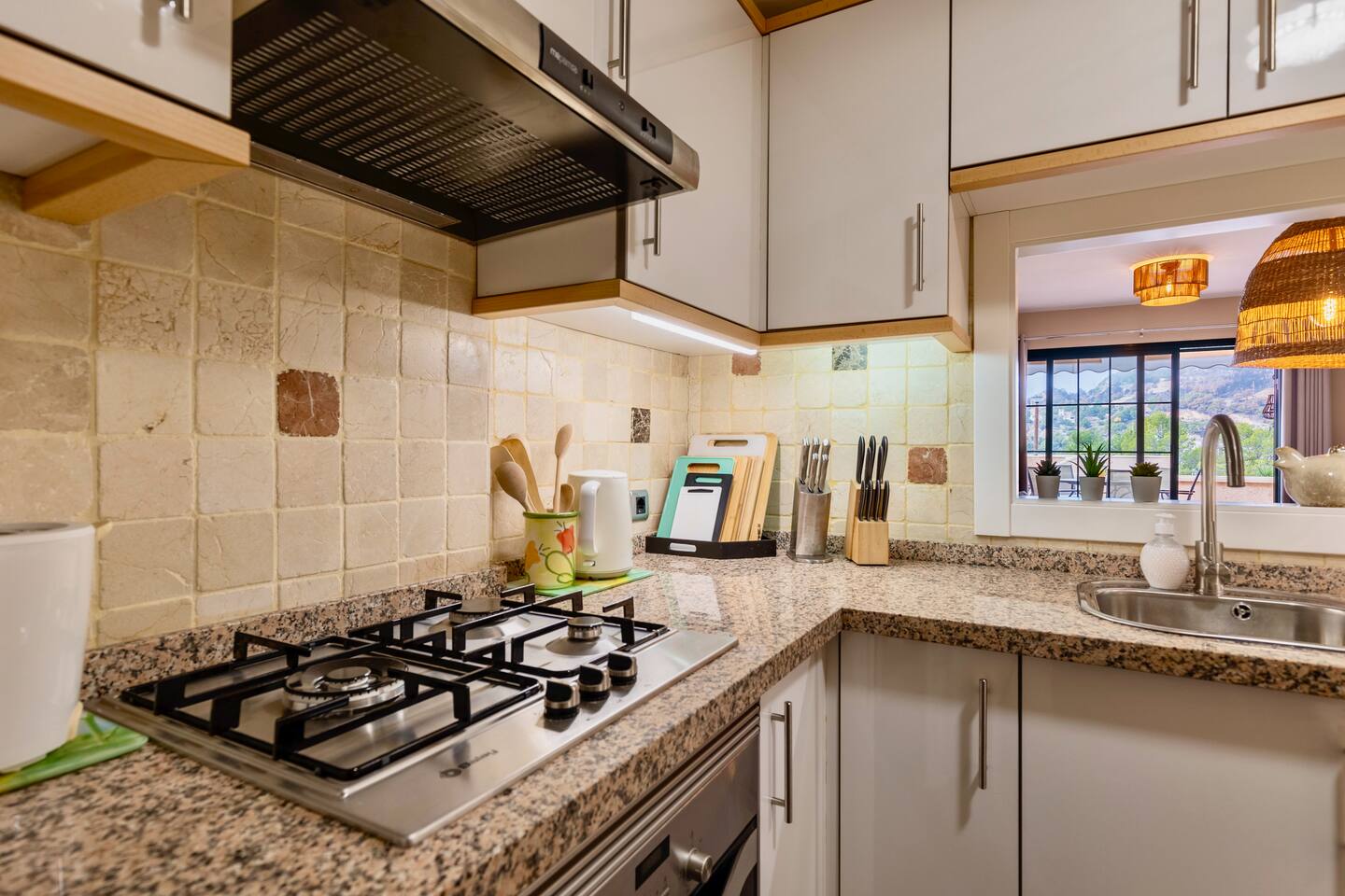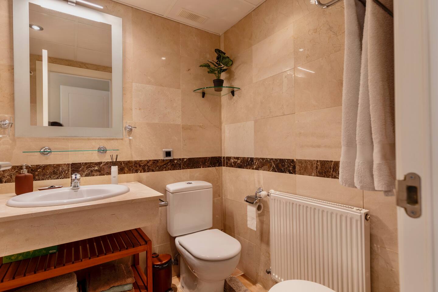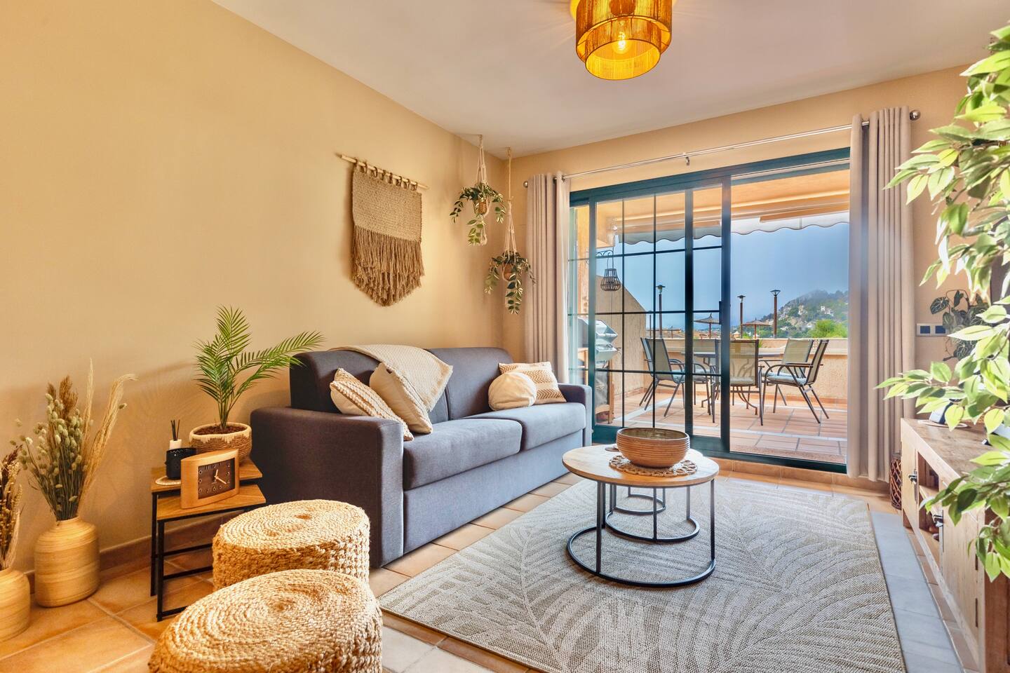 The very well-equipped apartment has a spacious living room with semi-open kitchen, 2 spacious bedrooms and 2 bathrooms. There is a large terrace with beautiful open views, dining room, relaxation corner and a good barbecue. There are many extras such as air conditioning and radiator heating in every room, satellite TV with all channels in all languages, fiber optic WiFi (600 Mb), a fully equipped kitchen with all amenities, a high-quality sofa (bed) in the living room, very suitable to enjoy the siesta.
